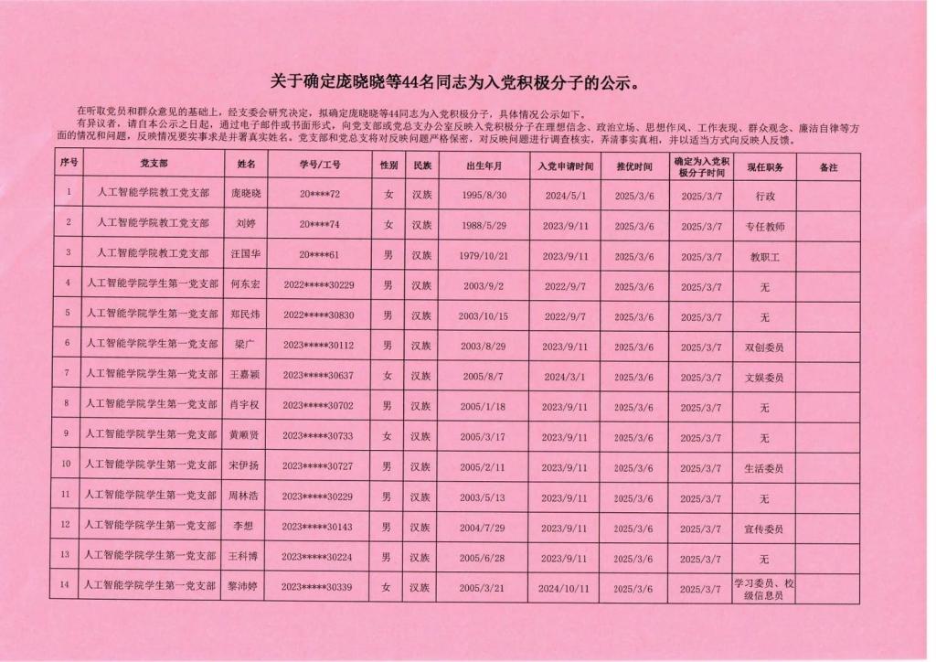 在听取培养联系人、党员和群众意见的基础上,经支委会研究决定,拟定庞晓晓等44名同志为入党积极分子,具体情况公示如下。