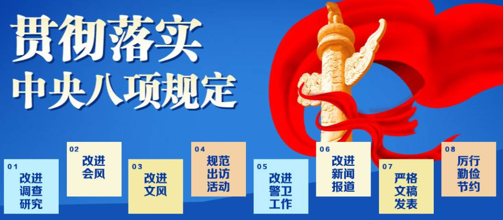 2012年12月4日,习近平总书记主持中央政治局会议,审议通过《十八届中央政治局关于改进工作作风、密切联系群众的八项规定》,从调查研究、会议活动等8个方面为加强作风建设立下规矩: