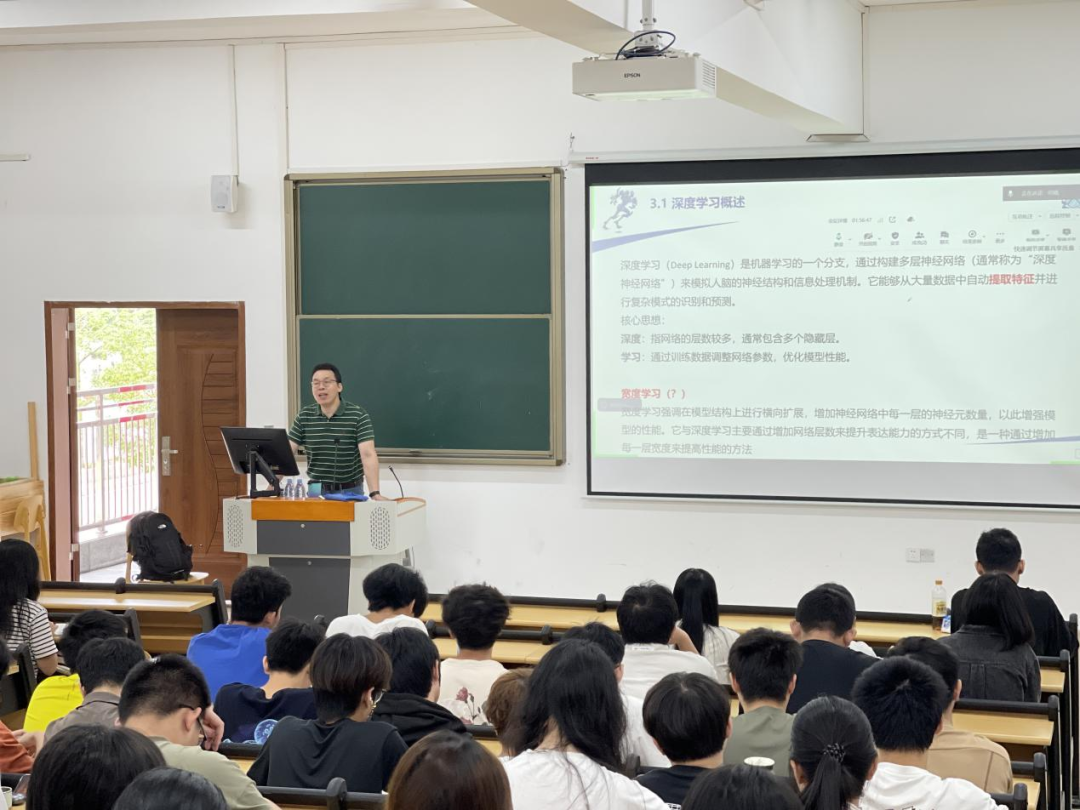随后,讲座进入了深度学习的环节。教授指出,深度学习是机器学习的一个子领域,它通过构建多层神经网络来模拟人脑的信息处理方式,从而实现对复杂数据的高效处理。他详细介绍了深度学习中的一些重要算法,如卷积神经网络(CNN)、循环神经网络(RNN)、长短时记忆神经网络(LSTM)和Transformer,并展示了它们在计算机视觉、自然语言处理和时序数据处理的应用场景。