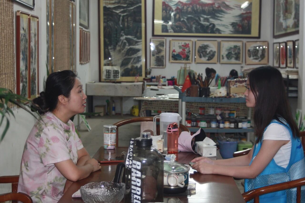 松韵客乡实践队队长欧阳欣与廖秀红老师交谈画作