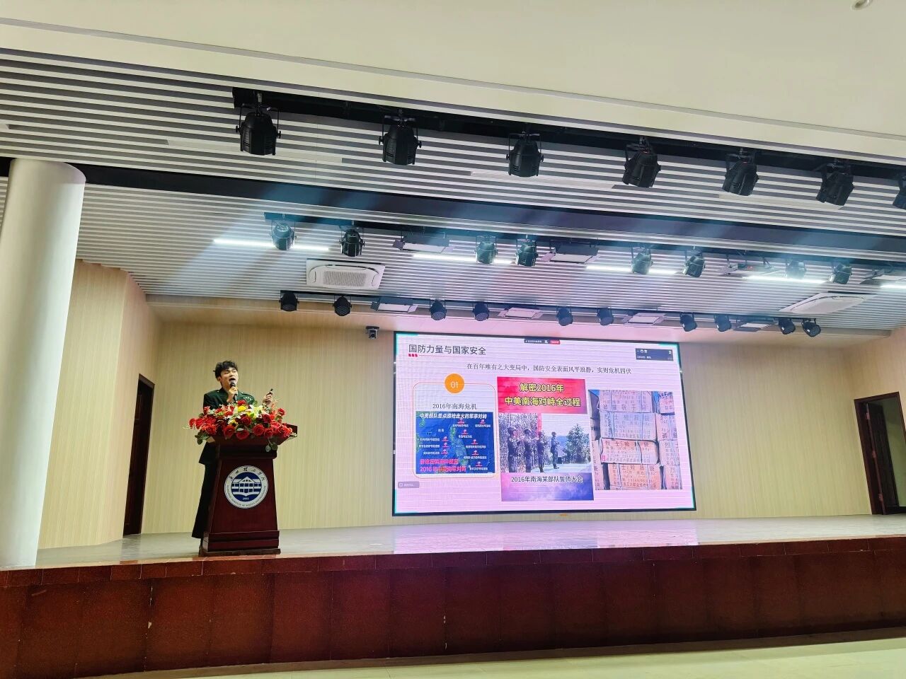 张耀辉从国防科技、全民国防意识、国防力量与国家安全的紧密关系入手,强调了国防建设在推动科技进步、经济发展和社会稳定中的重要作用。他结合南海危机、中印加勒万河谷冲突等现实案例,指出“表面风平浪静,实则危机四伏”,呼吁青年学子树立国防观念,积极投身国防事业。他还提到,现代战争对高精尖武器研发、军事指挥、外交、教育、医疗等多领域人才需求迫切,尤其欢迎大学生加入军队,成为强军事业的中坚力量。
