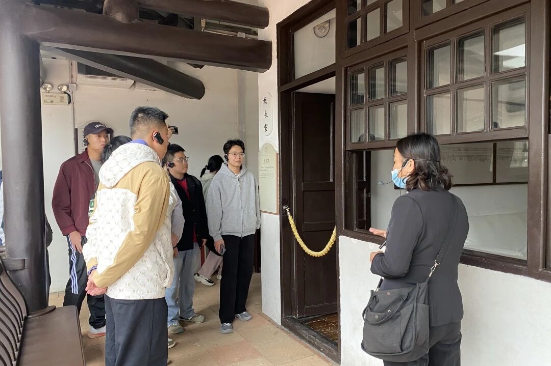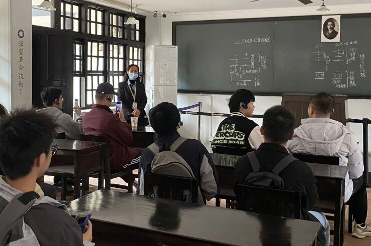 走进古朴庄重的军校,青砖黛瓦间沉淀着百年风云。在讲解员的引领下,同学们看到昔日军校二楼的办公旧址静静陈列。校长办公室的桌椅摆放依旧规整,政治部的文书卷宗仿佛还留着墨香,教务处的板书痕迹隐约可见,一幕幕场景鲜活还原了当年军校严谨有序的办学日常,让同学们直观感受革命先辈潜心育人、谋划救国的赤诚初心。同学们驻足凝视,不时轻声交流,深切体会先辈们在艰苦环境中坚守信念、砥砺奋进的担当。