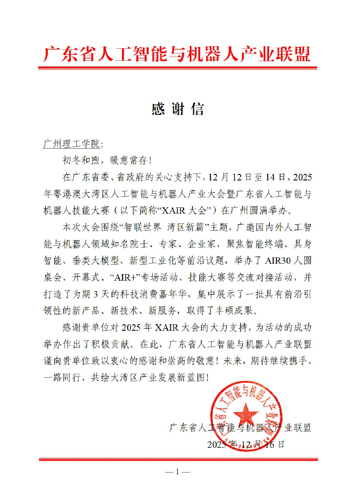 近日,我校收到广东省人工智能与机器人产业联盟发来的感谢信,信中对学校鼎力支持 2025 年粤港澳大湾区人工智能与机器人产业大会暨广东省人工智能与机器人技能大赛(XAIR 大会)表示衷心感谢,高度肯定了我校为大会成功举办作出的积极贡献。