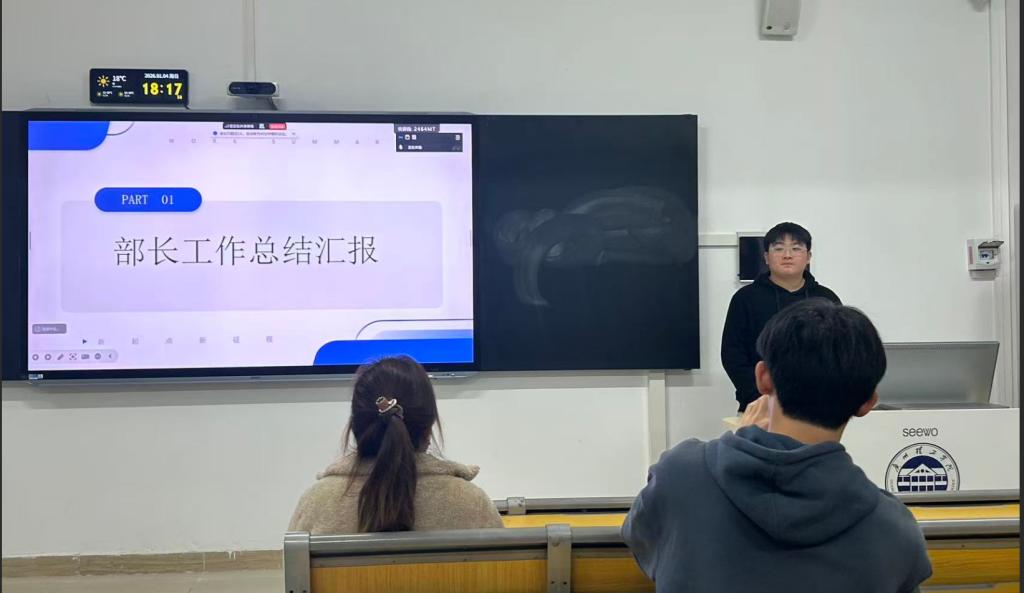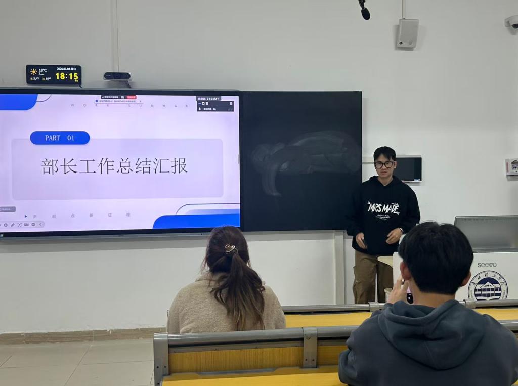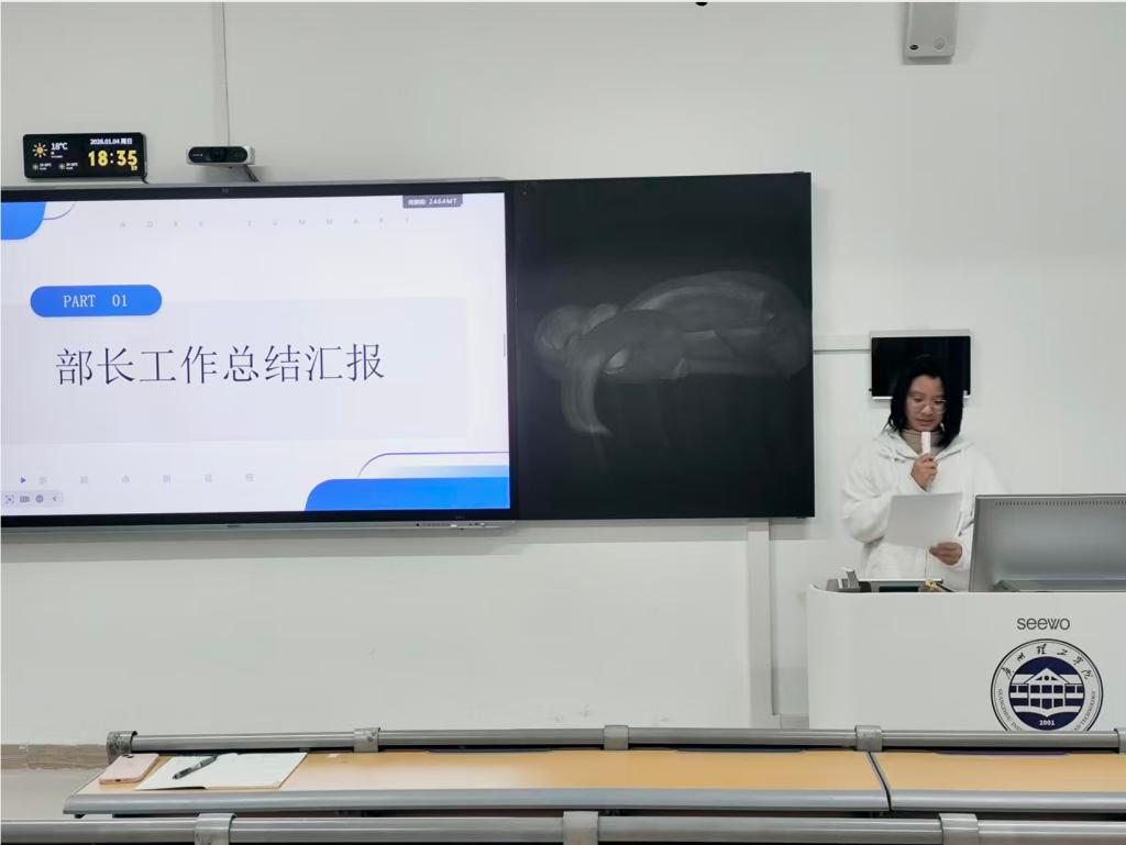 会议伊始,各部门部长依次上台作工作总结汇报,全面梳理本学期工作成果、深刻剖析现存不足,并明确未来努力方向。