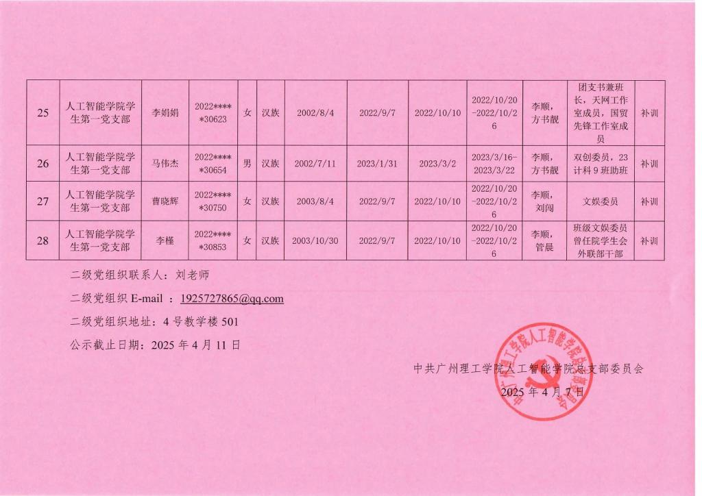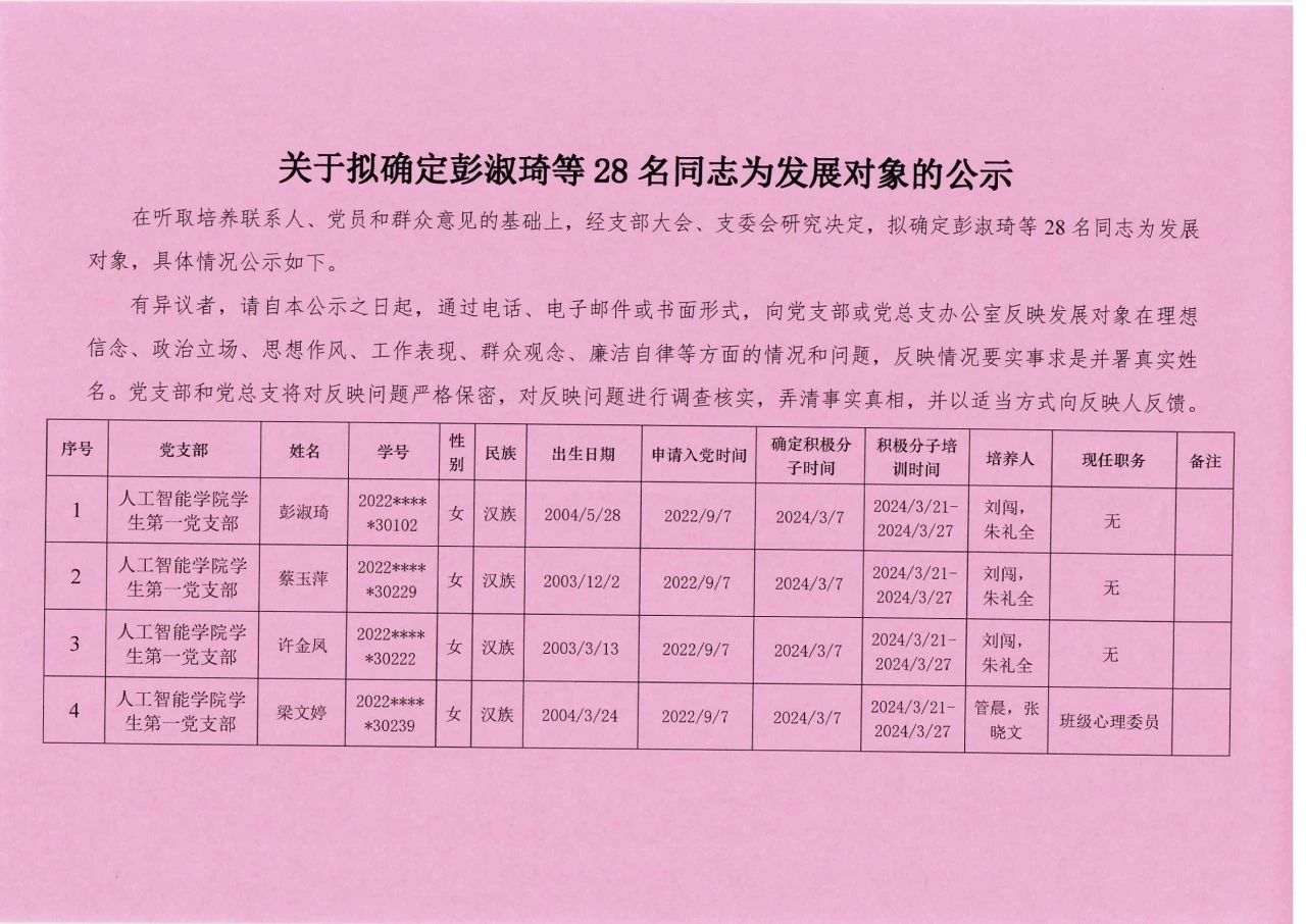 在听取培养联系人、党员和群众意见的基础上,经支委会研究决定,拟定彭淑琦等28名同志为发展对象,具体情况公示如下。