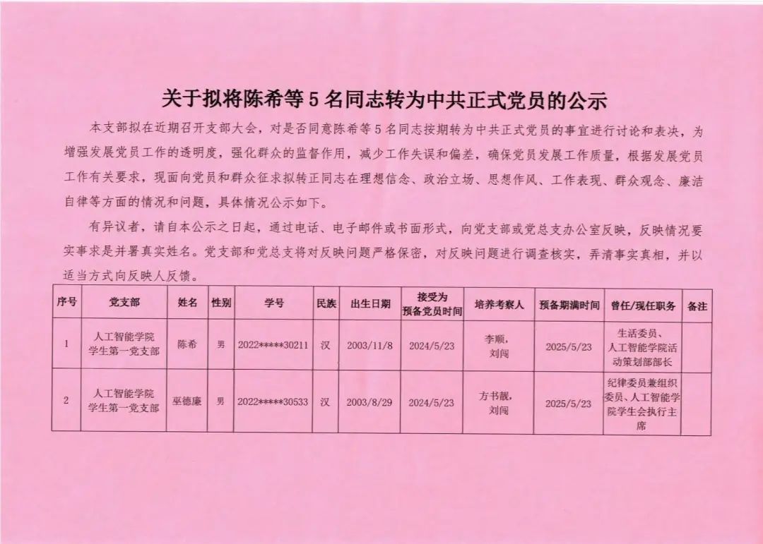 关于拟将陈希等5名同志转为中共正式党员的公示